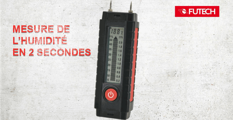 Mesurez l'humidité de tous vos bois et matériaux de construction avec cet humidimètre numérique de Futech. Cet humidimètre compact, que vous pouvez emporter partout, a une plage de mesure allant jusqu'à 40 °C.