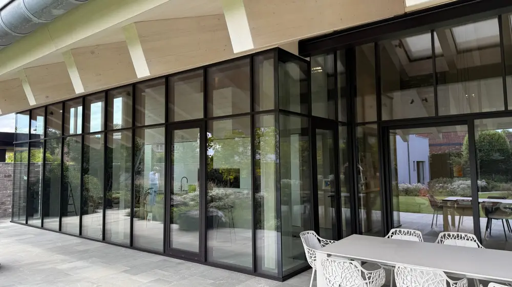 Oben a réalisé la menuiserie extérieure d'une maison neuve moderne, où l'aluminium, le verre et le béton apparent se côtoient harmonieusement. Ce projet peut se targuer d'une primeur: la toute première utilisation du système de mur-rideau SW35 de Reynaers.